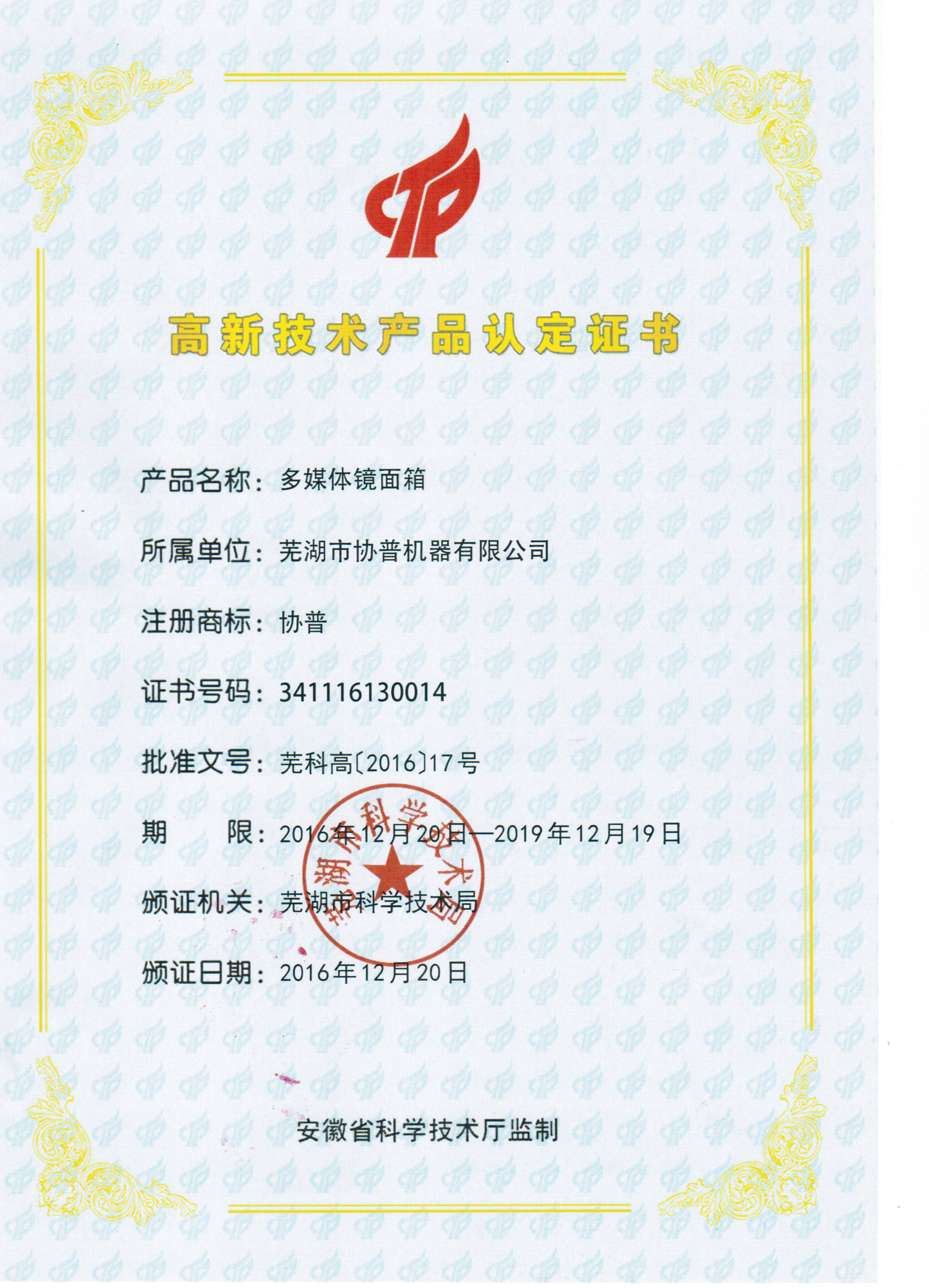 2016年9月,為提高產(chǎn)品知名度,我公司將一款新型高技術(shù)產(chǎn)品申報(bào)安徽省高新技術(shù)產(chǎn)品,經(jīng)安徽省科技廳專家評(píng)審,于2016年12月正式通過(guò)審核。