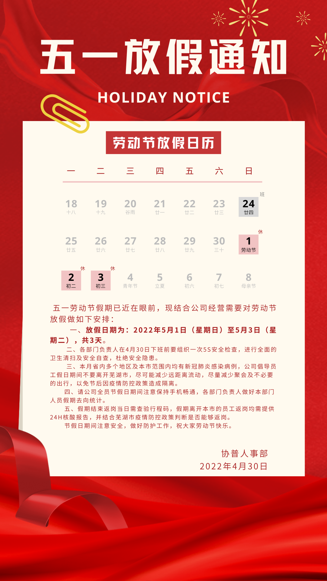 同時,也希望大家在享受“五一”假期的同時,做好個人防護,注意自身安全,過一個平安的勞動節(jié)!