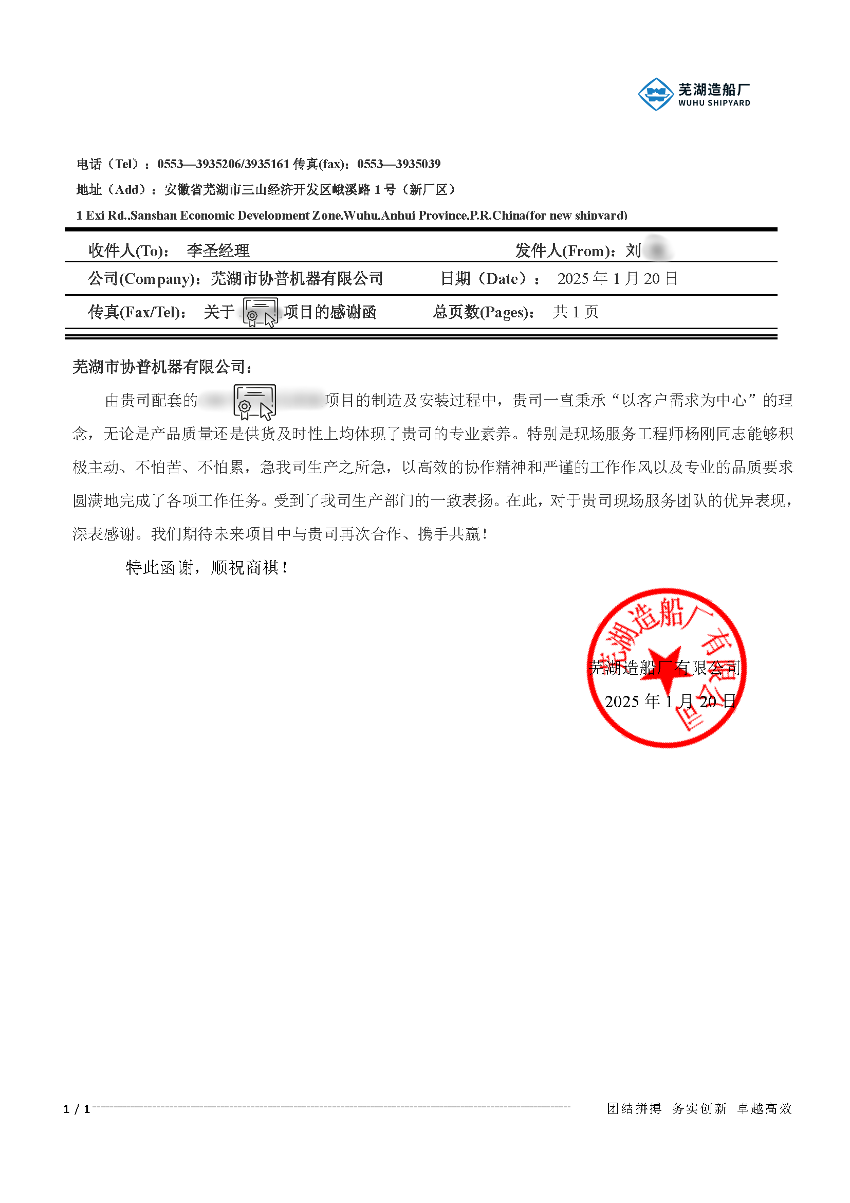 2025年,協(xié)普在給蕪湖船廠配套項目的制造及安裝過程中,一直秉承“以客戶需求為中心”的理念,無論是產(chǎn)品質(zhì)量、還是供貨及時性以及現(xiàn)場的服務(wù)均受到了蕪湖造船廠的高度認(rèn)可。協(xié)普團隊,以高效的協(xié)作精神和嚴(yán)謹(jǐn)?shù)墓ぷ髯黠L(fēng)以及專業(yè)的品質(zhì)要求圓滿地完成了各項工作任務(wù)。受到了蕪湖造船廠生產(chǎn)部門的一致表揚。